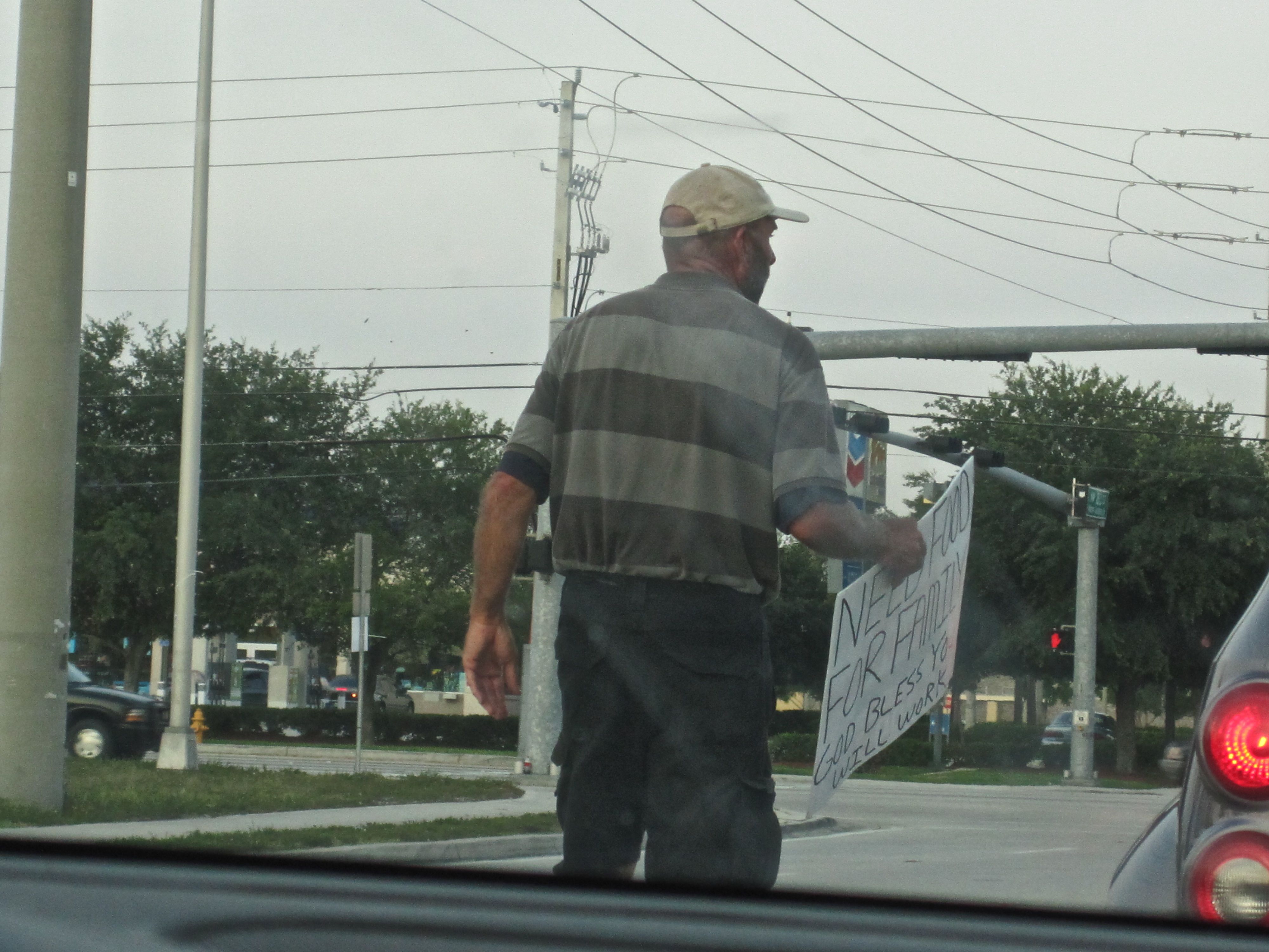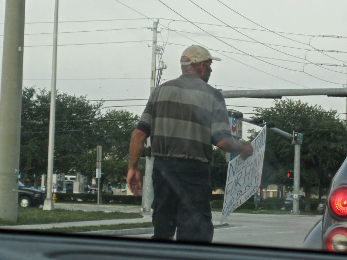Perhaps, he needs it today but he did not need it yesterday. I first met him in 2007, panhandling, when I needed his help to push my old car off the road away from the incoming traffic. Back then it was only $20.00 tip for his assistance but I see the need in today’s economy. Still what is wrong with this picture?